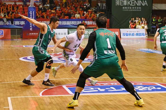 在与赣州队的对战中,宜春队球员面对防守从容不惧,强硬上篮。